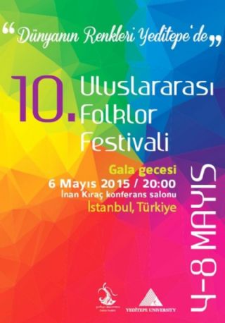 Yeditepe Üniversitesi “10. Uluslararası Folklor Festivali” Yabancı ülkelere ait halk dansları topluluklarının yanı sıra yurdumuzun farklı sivil toplum örgütleri ile üniversitelerinin halk dansları topluluklarının katılacakları ve de üniversite protokolümüzle birlikte davetlilerin de izleyecekleri Gala Programı 06 Mayıs 2015 – Çarşamba akşamı saat 20.00’da Yeditepe Üniversitesi Kayışdağı - 26 Ağustos Yerleşkesi Rektörlük Binası‘ndaki İnan Kıraç Konferans Salonu’nda yapılacak.