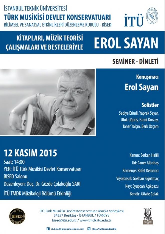 “KİTAPLARI, MÜZİK TEORİSİ ÇALIŞMALARI VE BESTELERİYLE EROL SAYAN” başlıklı etkinlikte Erol Sayan’ın kitapları ve kitaplarında konu aldığı müzik-makam teorisi konular işlenecek.