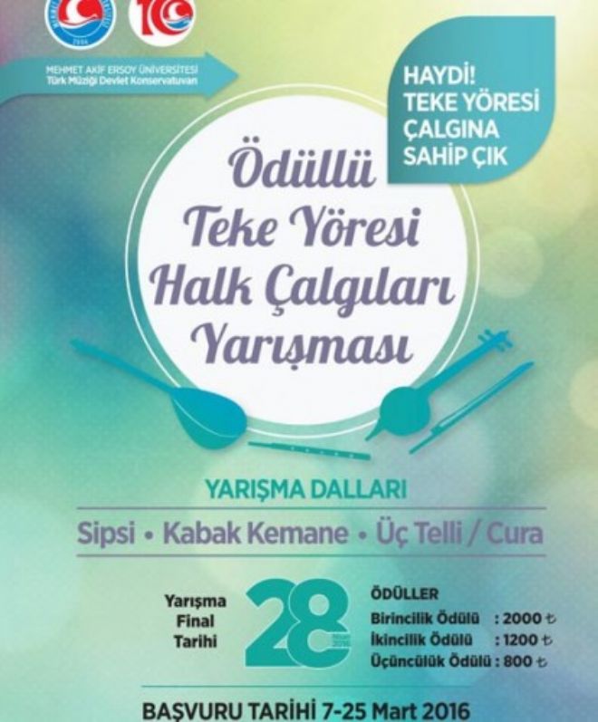 Teke Yöresi geleneksel halk çalgılarının yayılıp yaşatılmasını sağlamak, yöre çalgılarına yönelik farkındalık yaratmak, yörede yeni yeteneklerin keşfedilmesini sağlamak amacıyla 28 Nisan 2016 tarihinde ödüllü “Teke Yöresi Halk Çalgıları Yarışması” gerçekleştirilecek.