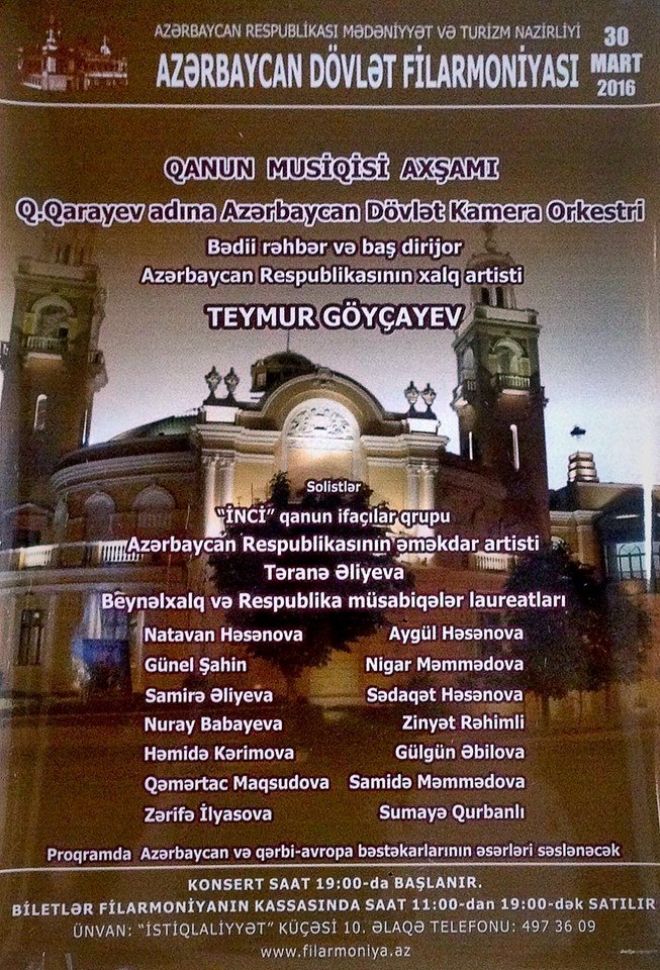 "Degerli dostlarım; xüsusən də sənətçi həmkarlarım, sizi mənim şagirdlərim və tələbələrimlə birgə hazırladığımız konsertimizdə böyük məmmuniyyətlə gözləyirik…"