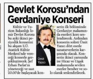 Kültür ve Turizm Bakanlığı İzmir Devlet Klasik Türk Musikisi Korosu'nun 31 Mart 2016 akşamı İzmir AKM'de Ümit Yazıcı solistliğinde vereceği konser, aynı gün Diyarbakır'da bombalı terörist saldırı sonucu 7 polisimizin şehit olması, 13 polis ile çevrede bulunan 14 vatandaşın yaralanması olayı üzerine tehir edildi.
