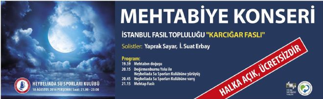 Heybeliada'da her yaz geleneksel olarak yapılan "Mehtap Faslı" bu yıl 18 Ağustos 2016 Perşembe saat 21.00'de, Heybeliada Su Sporları Kulübü'nde...