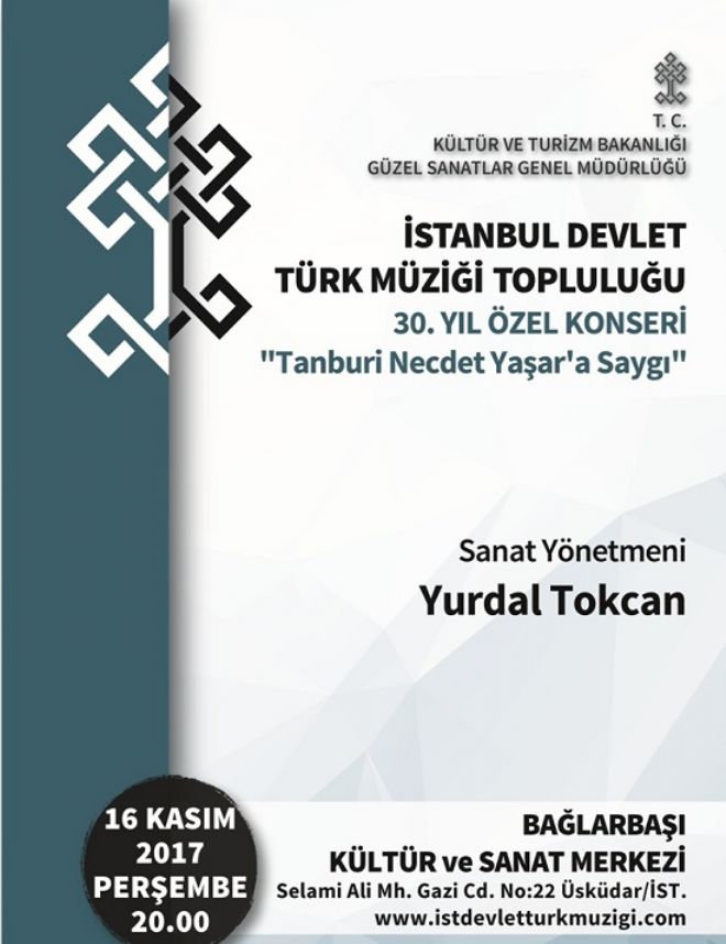 Kültür Turizm Bakanlığı İstanbul Devlet Türk Müziği Topluluğu 30. kuruluş (1987) yıldönümünü Üsküdar Belediyesi Bağlarbaşı Kültür ve Sanat Merkezi'nde verecekleri konser ile kutluyor.