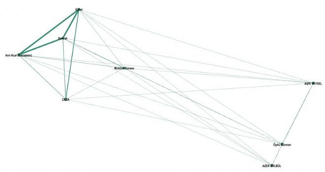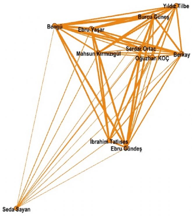 Yüksek bağlılık içeren ilişkiler içinde Devlet Bahçeli’nin karşısında iki isim görüyoruz: Ali Kınık ve Ahmet Şafak ki bu sanatçıların da milliyetçilik konusunda görüşleri açık. İlk onda Saadet Partisi ve İYİ Parti liderleri ise bulunmuyor.