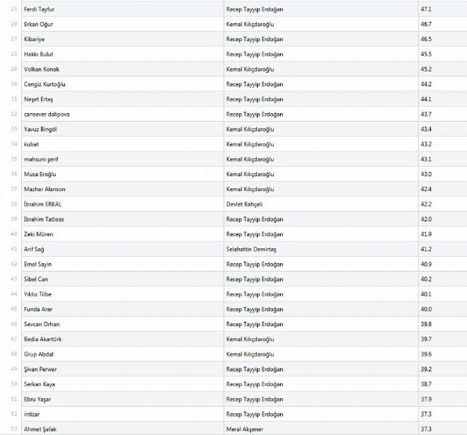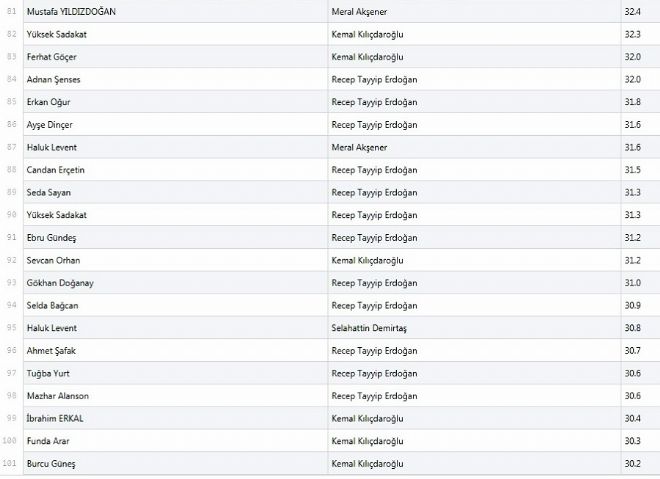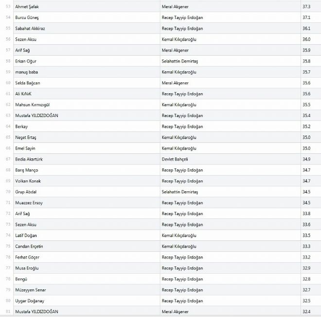 Söz konusu Erdoğan olduğunda benzer bir tutarlılığı izlemek zor. Erdoğan’la en sıkı bağı Yavuz Bingöl’ün kurduğu görülüyor. Diğer isimlerse Uğur Işılak, Sedat Uçan, İbrahim Erkal ve Latif Doğan ki bunlar Erdoğan hayranlıklarını gizlemeyen isimler. Ancak Yavuz Bingöl konusunda dikkatli olmak gerek; çünkü Bingöl, altı liderin tamamında ilk onda çıkan yegane isim. Bu haliyle zaman zaman muhalefetin sert eleştirilerine muhatap olsa da epey birleştirici bir isim olduğu muhakkak. Bir zamanlar yarattığı protest türkücü kimliği mi, bizatihi müziği mi etkili bilmiyoruz, ama Kılıçdaroğlu’nun takipçileri de halen Bingöl’ü silmemiş anlaşılan.