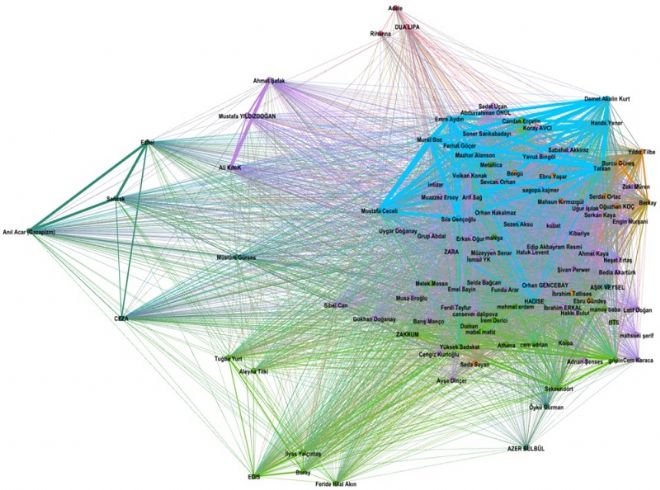 Haritanın neredeyse yarısına karşılık gelen mor renkli en kalabalık grubu, herkes tarafından takip edilen, genel beğeniye hitap eden sanatçılar diye değerlendirebiliriz. Buradaki sanatçıların takipçileri, bu gruptaki diğer sanatçıları da takip ediyorlar, ancak aralarındaki bağlantı, yani ortak takipçi sayıları, küçük gruplardaki kadar çok değil. Bu da dağınık bir yerleşime sahip olmalarına neden oluyor. Bu grup müzik stilleri açısından tam bir bütünlük arz etmiyor olabilir, ancak hepsi geniş kitlelere hitap ediyorlar ve takipçileri çok sayıda başka sanatçıyı da takip ediyor, dışlamıyorlar. Bu grup içinde yer almakla birlikte, kendi aralarında ufak bir ‘çete’ gibi görünen Ali Kınık, Mustafa Yıldızdoğan ve Ahmet Şafak’a da dikkat etmek lazım. Bu isimlere siyasilerle bağlarında da benzer gruplarda görüyoruz.