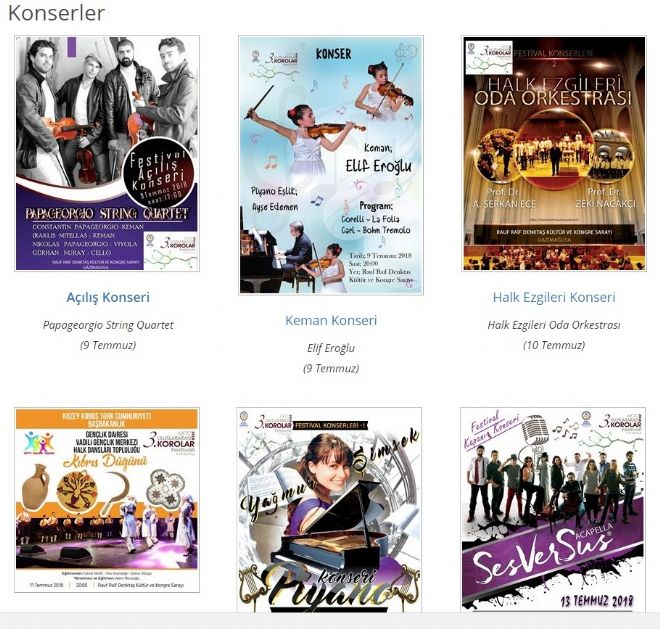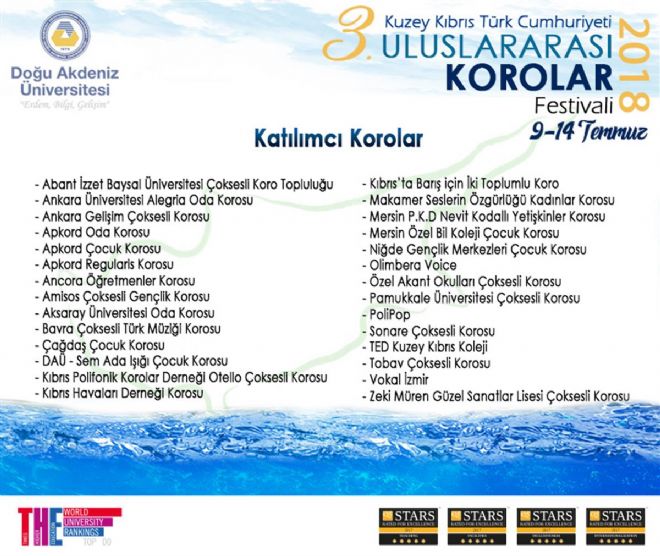 KKTC Uluslararası Korolar Festivali konserleri 9-14 Temmuz 2018 tarihleri arasında Gazimağusa'da Doğu Akdeniz Üniversitesi kampüs ve tesislerinde,konserler ise Rauf Raif Denktaş Kültür ve Kongre Sarayı'nda izlenebilir.