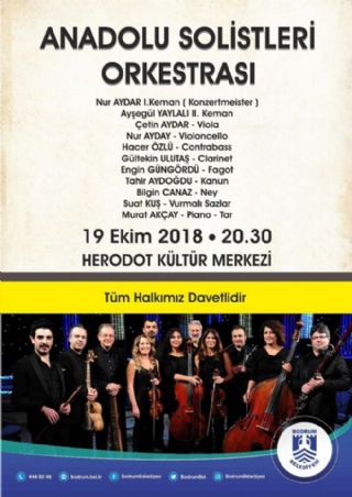 Geleneksel Türk müziğinin orkestral boyutu öteden beri dile gelir. Bu alandaki çalışmalar ayrı bir önem arzeder. Anadolu Solistleri geleneksel Türk müziğini orkestral boyuta götürecek önemli bir topluluk. 19 Ekim 2018'de Bodrum'da sanatlarını, Anadolu'nun bu topraklar kaynaklı orkestral beste ve düzenlemelerini seslendirecekler. Bodrum Herodot Kültür Merkezi, Saat 20.30 ...