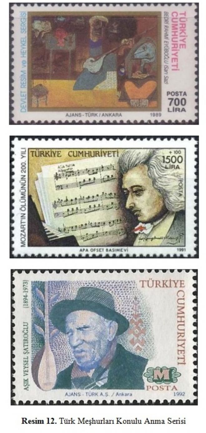 …1966 yılında basılan Türk Büyükleri ve Meşhurları Portreli Sürekli Serisi'nde iki Türk musikisi bestecisine yer verilmiş olması önemlidir. Serinin ilk musikişinası Hüseyin Sadettin Arel ve diğer musikişinas ise Tanburi Cemil Bey'dir (Resim 4)… İlk müzik konulu pul ise 1982 yılında "Türk Müzik Aletleri" başlığı altında basılmıştır. Geleneksel Türk Halk Müziği çalgılarından bağlama, davul, zurna, kemençe ve mey resimlerine yer verilmiştir (Resim 6)…