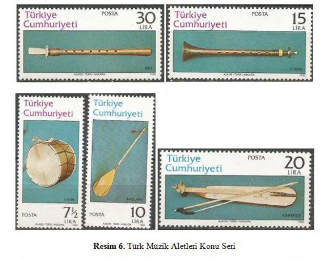 İlk müzik konulu pul ise 1982 yılında "Türk Müzik Aletleri" başlığı altında basılmıştır. Geleneksel Türk Halk Müziği çalgılarından bağlama, davul, zurna, kemençe ve mey resimlerine yer verilmiştir (Resim 6).