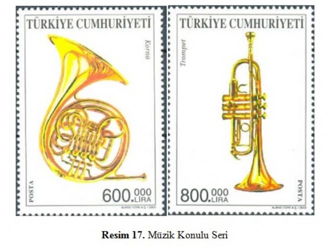 2003 yılında da yine konu başlığı "Müzik" olan iki adet pul basılmıştır. Bu pullarda ise Batı müziği çalgılarından korno ve trompet'e yer verilmiştir (Resim 17).