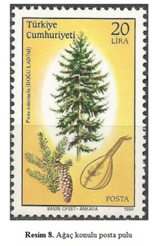 1984 yılında "Ağaç" konulu posta pulları üzerinde "Doğu Ladini" teması içerisinde "ud" resmine yer verilmiştir (Resim 8). Çalgı yapımında çok önemli bir yere sahip olan ladin ağacının (Picea Orientalis), özellikle Doğu Ladini'nin ud çalgısının yapımında kullanılması bağlamında pul üzerinde resmedilmesinin önemli bir tespit ve karar olduğunu söyleyebiliriz.