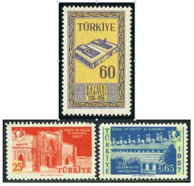 Konu itibariyle müzik amaçlanmamış olmasına ve bir müzik enstrümanı resmedilmemiş olmasına rağmen "Kayseri Şifahiyesi'nin Kuruluşunun 750. Yılı" konulu ve 1957 tarihli "Dünya Tıp Birliği XI. Kongresi" konulu anma pullarında yer verilen darüşşifahane resimleri, musiki ile tedavi yapılmış olması açısından dikkate değerdir (Resim 3).