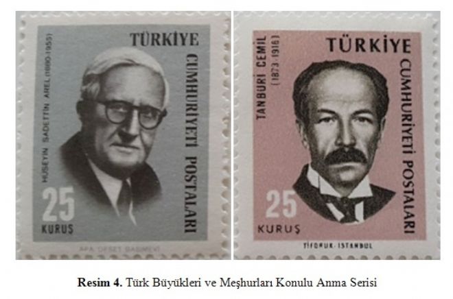 1966 yılında basılan Türk Büyükleri ve Meşhurları Portreli Sürekli Serisi'nde iki Türk musikisi bestecisine yer verilmiş olması önemlidir. Serinin ilk musikişinası Hüseyin Sadettin Arel ve diğer musikişinas ise Tanburi Cemil Bey'dir (Resim 4).