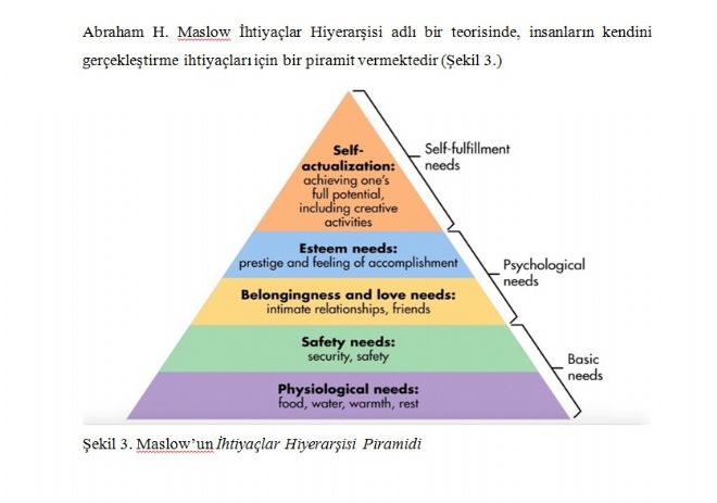 Abraham H. Maslow İhtiyaçlar Hiyerarşisi adlı bir teorisinde, insanların kendini gerçekleştirme ihtiyaçları için bir piramit vermektedir (Şekil 3.)